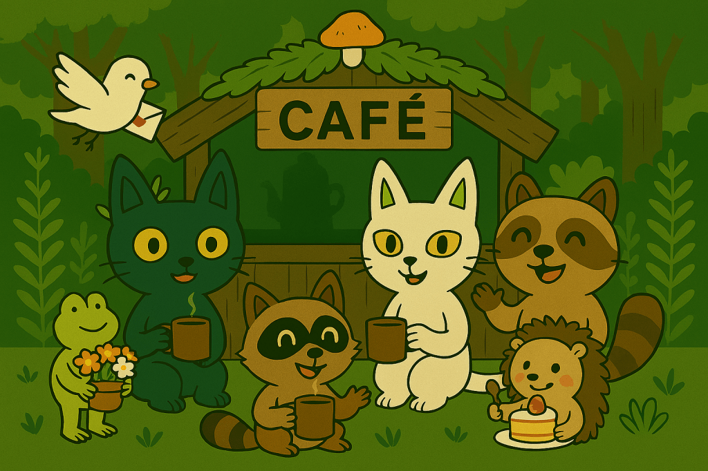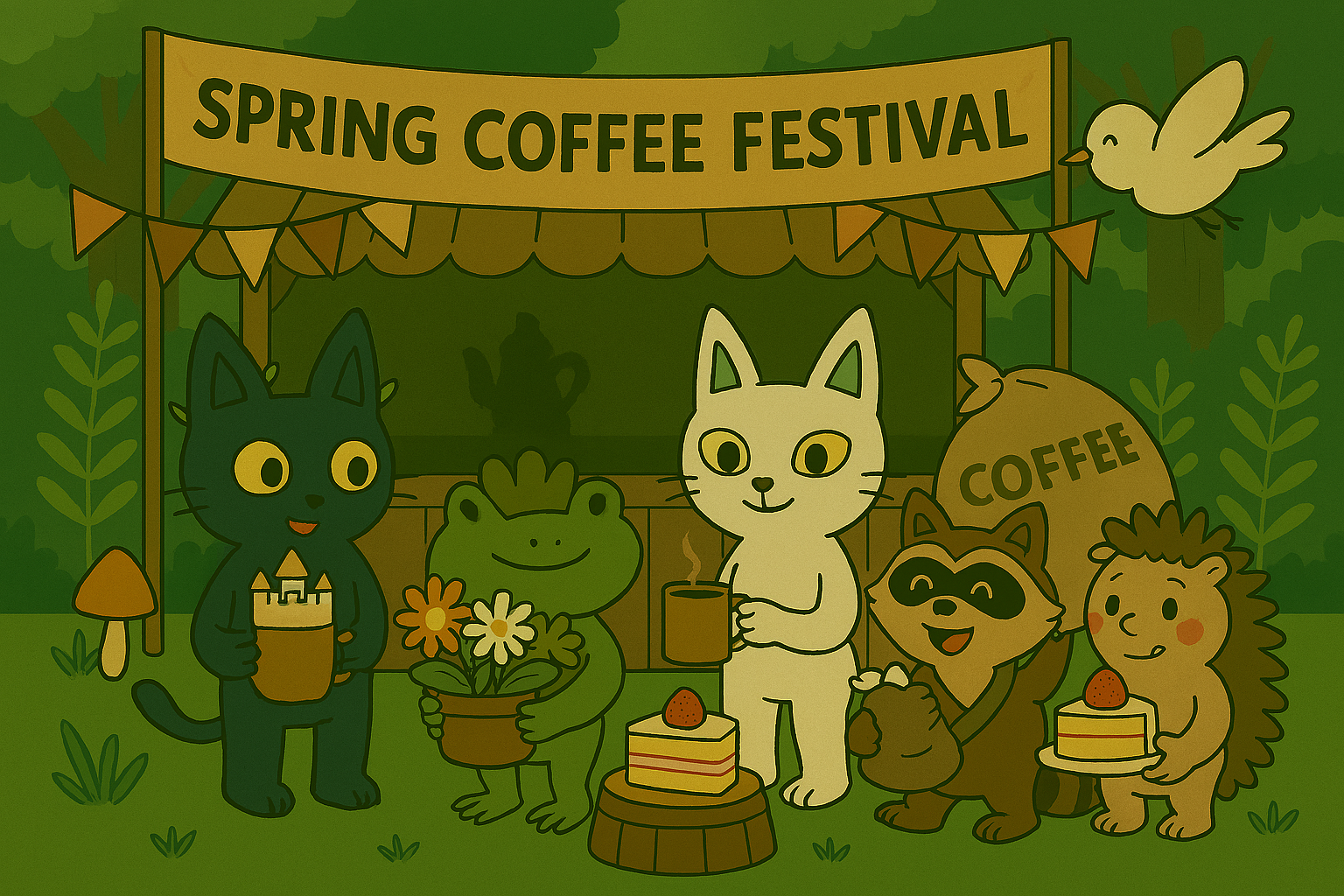 春天咖啡慶典即將開始,森林精靈們都忙著準備啦!阿淘端出城堡造型的飲料、小雪微笑著端著招牌咖啡、廷廷搬著咖啡豆袋準備開講、青蛙精靈展示滿滿的花苗、鳥精靈在空中送信…而嗑嗑呢?牠一邊咬著嘴唇、一邊偷偷把蛋糕藏進懷裡,眼神閃爍著「沒人發現吧」…