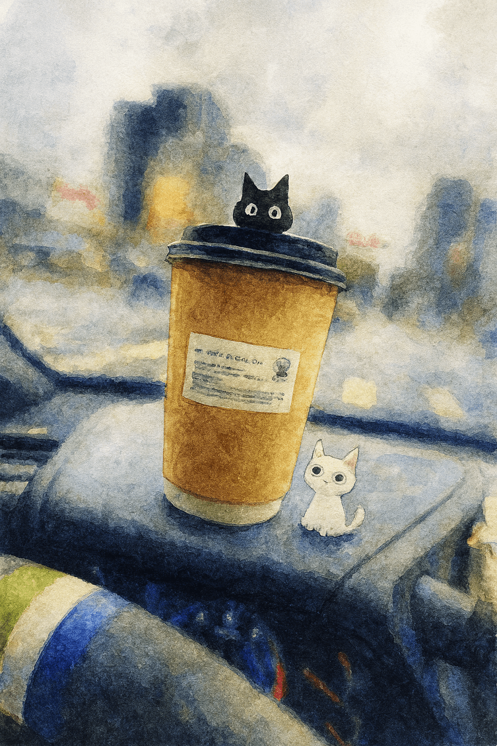 我坐在駕駛座上,前方的道路上尚且安靜,只有偶爾幾輛車輛駛過。我將阿淘黑貓精靈和小雪白貓精靈畫作在咖啡杯旁,為這個日常增添了一絲俏皮。這一刻,享受著生活的簡單與美好,心中充滿了工作的期待。